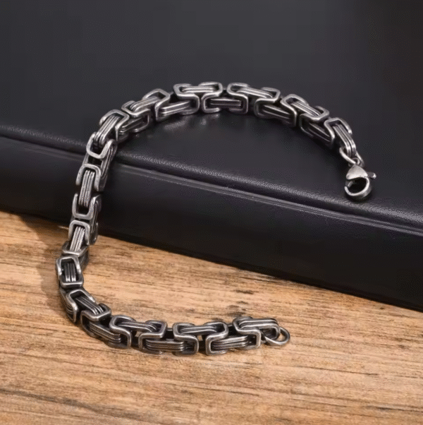 Crafted from premium 316L stainless steel, this bracelet features a bold box-chain design with an ancient silver finish — giving it a timeless, masculine look inspired by Viking craftsmanship.